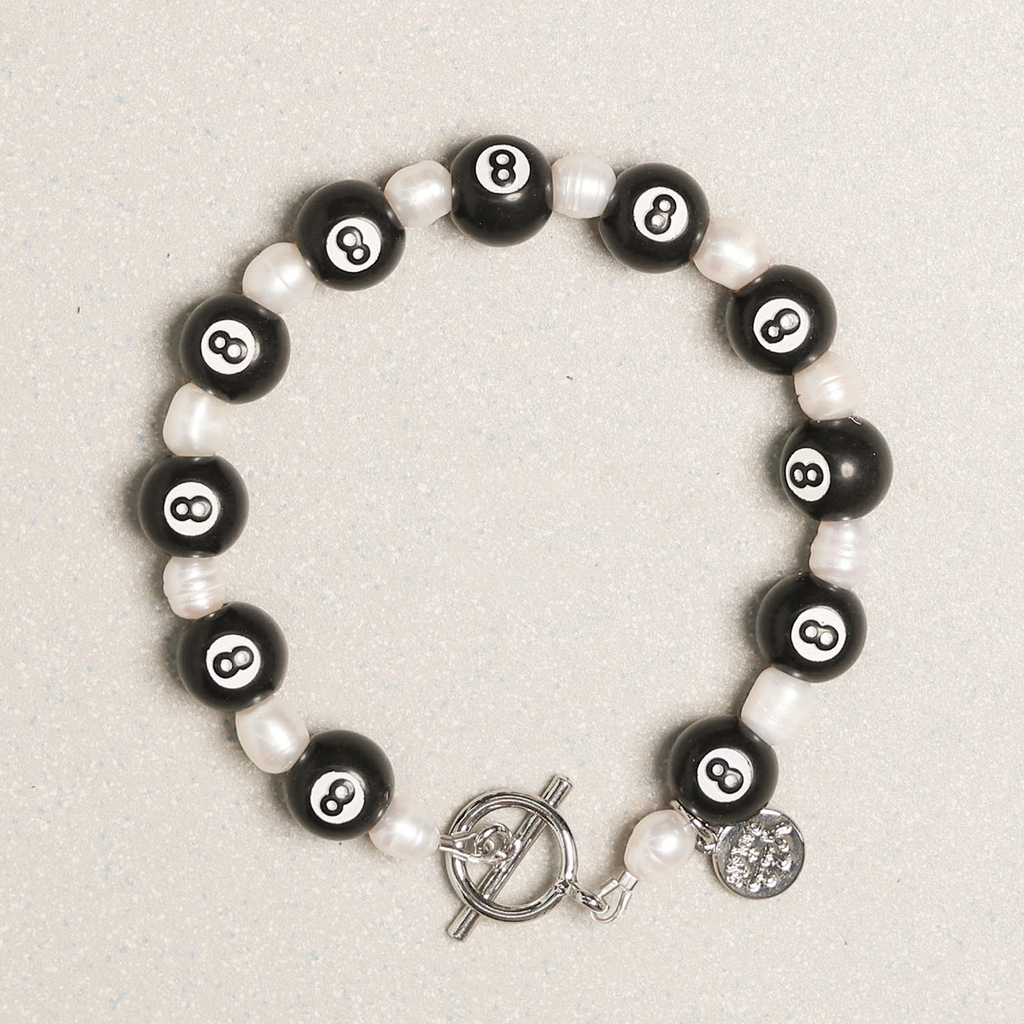 마치 어린시절 가지고 놀던 장난감처럼, 진주와 에잇볼이 만나 자칫 무거울수 있는 분위기가 키치함으로 변주된 제품 입니다.
