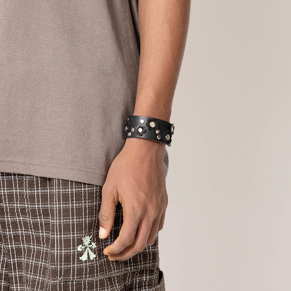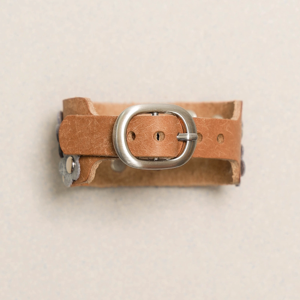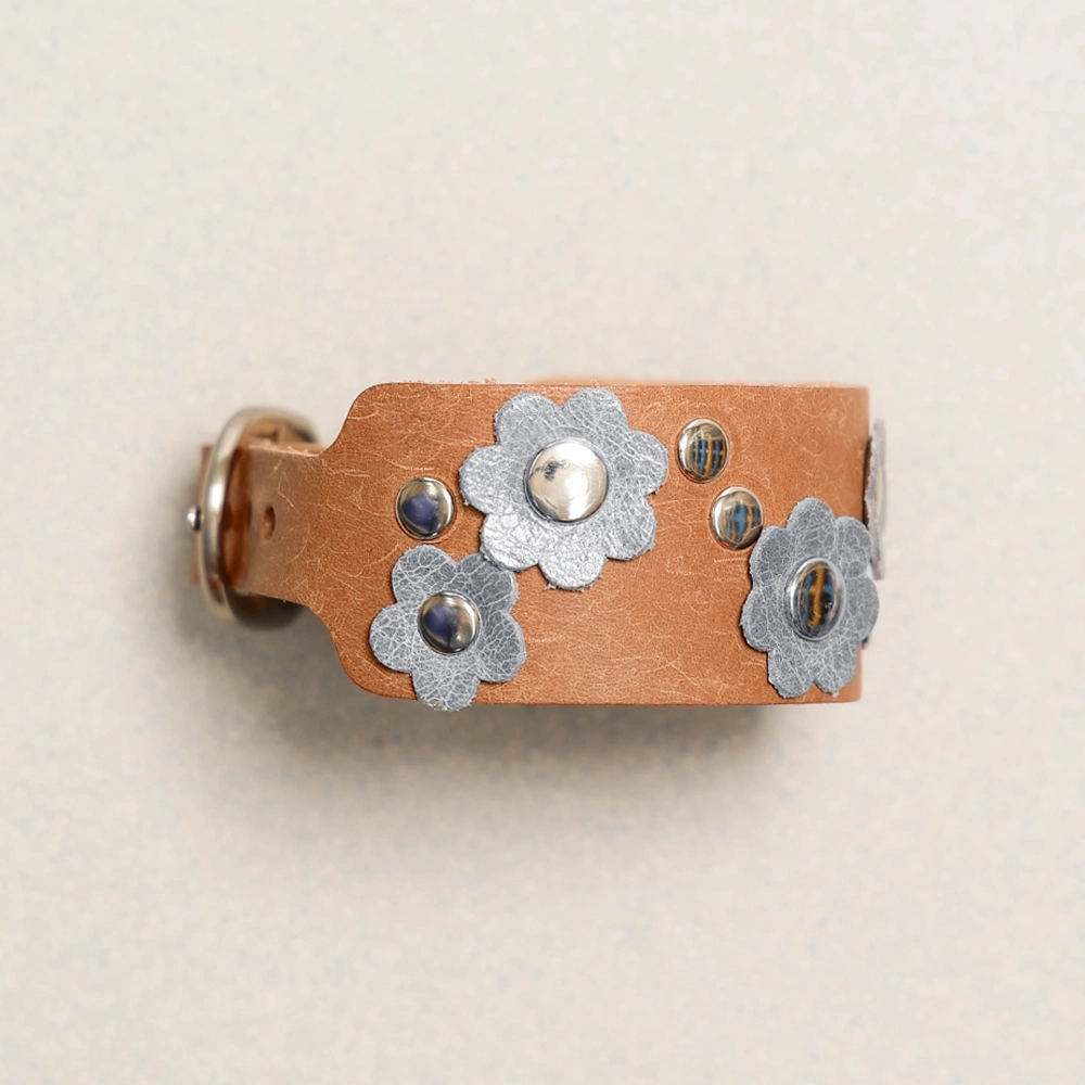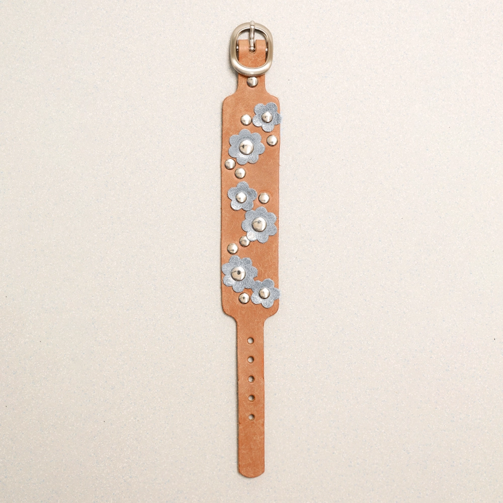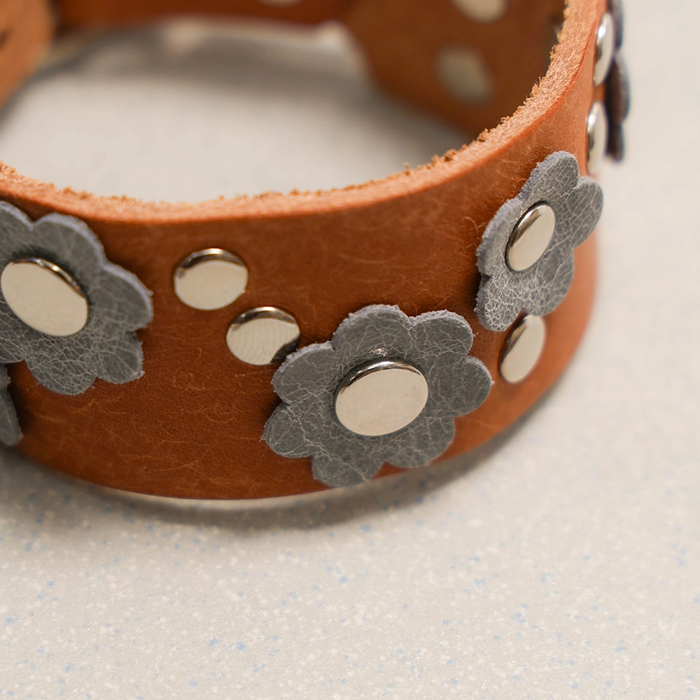 가죽 팔찌 위, 꽃 모티브를 아일렛과 결합하여 제작된 팔찌입니다.