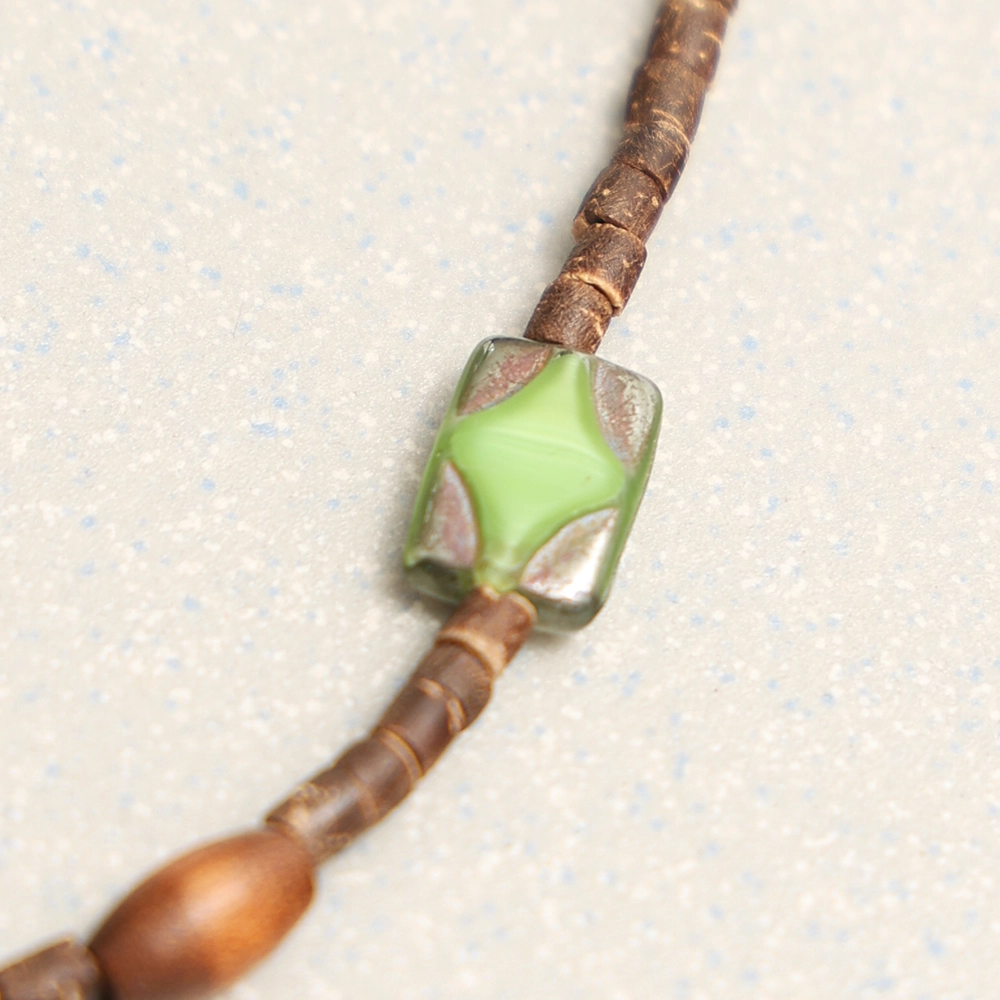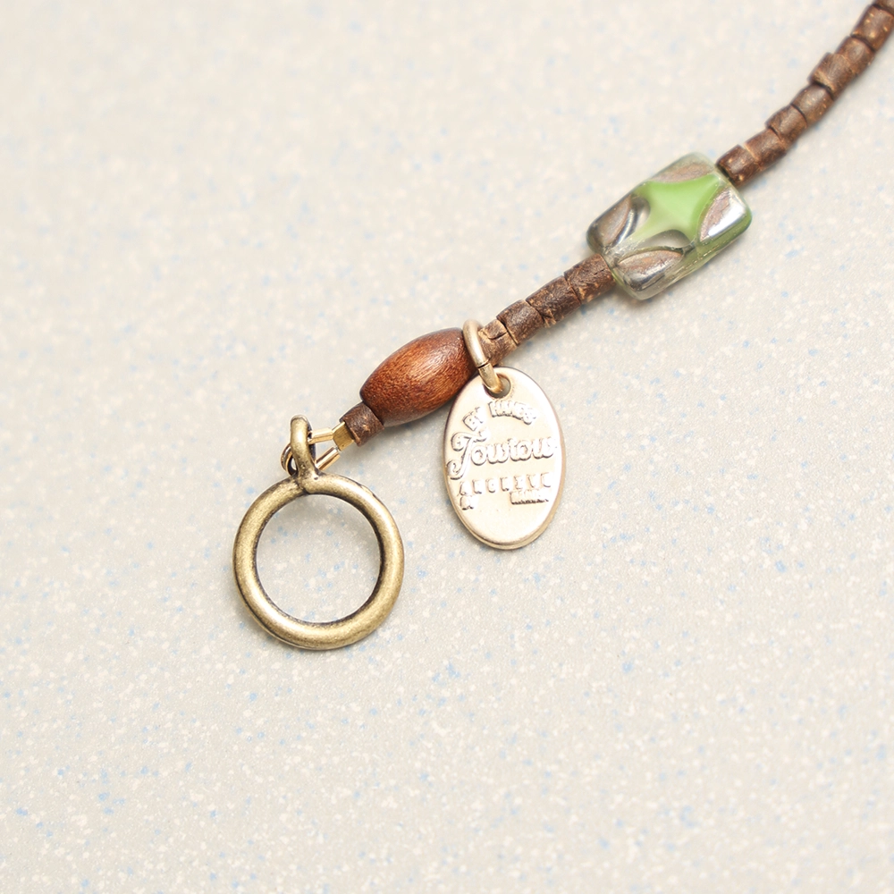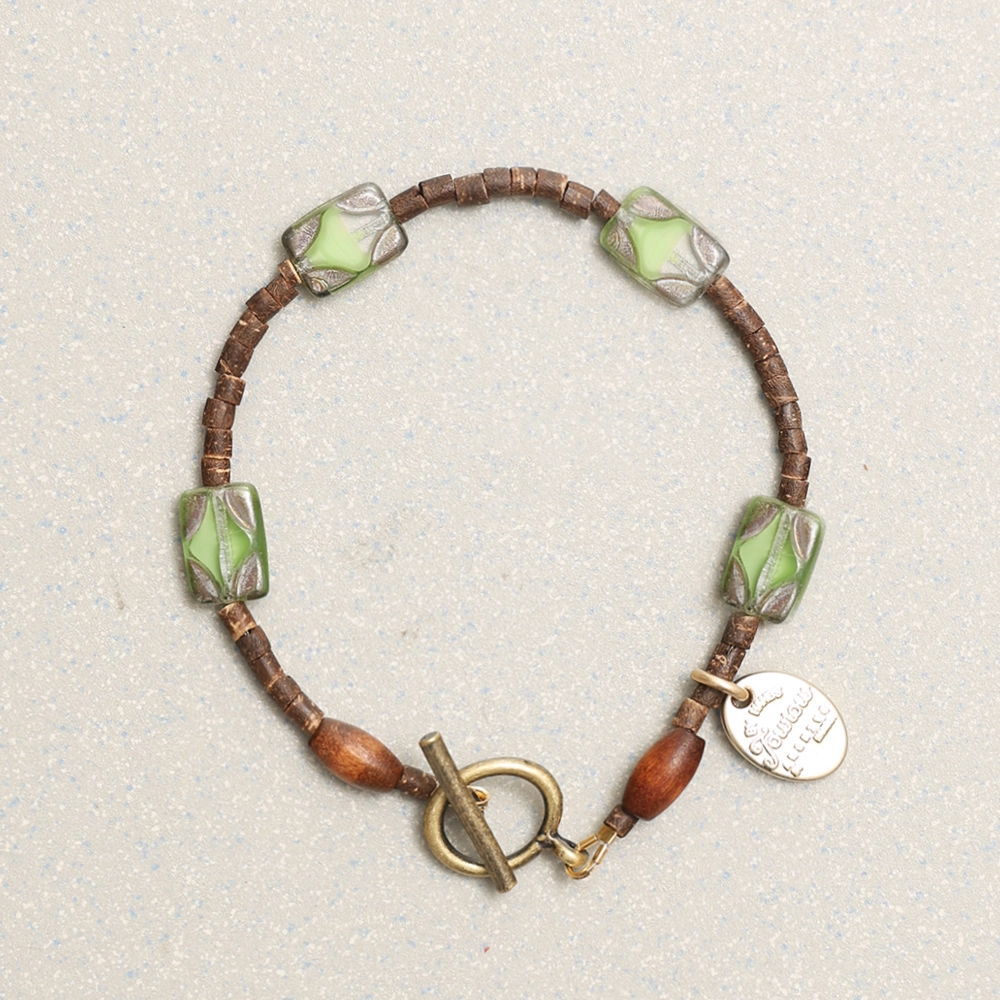 그린 톤의 유리 비즈와 브라운 우드 비즈를 교차 배열해 제작된 샤인 팔찌 그린입니다. 슬림한 원통 비즈를 베이스로, 반투명한 그린 비즈를 포인트로 배치해 색감 대비가 자연스럽게 이어지는 구성입니다.
