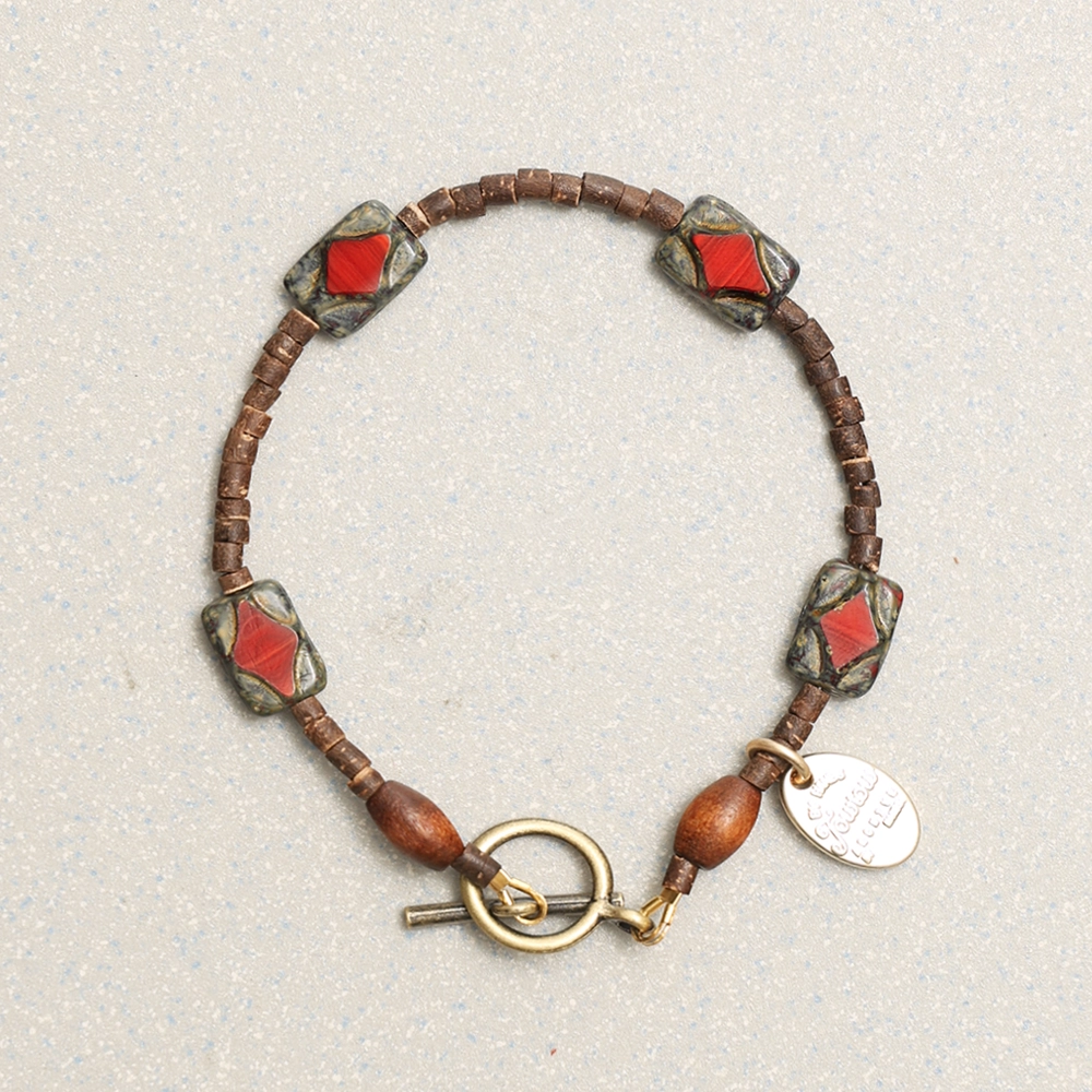 레드 톤의 유리 비즈와 브라운 우드 비즈를 교차 배열해 제작된 샤인 팔찌 레드입니다.