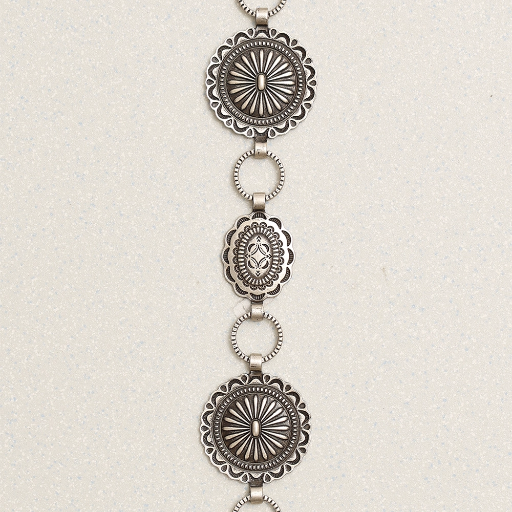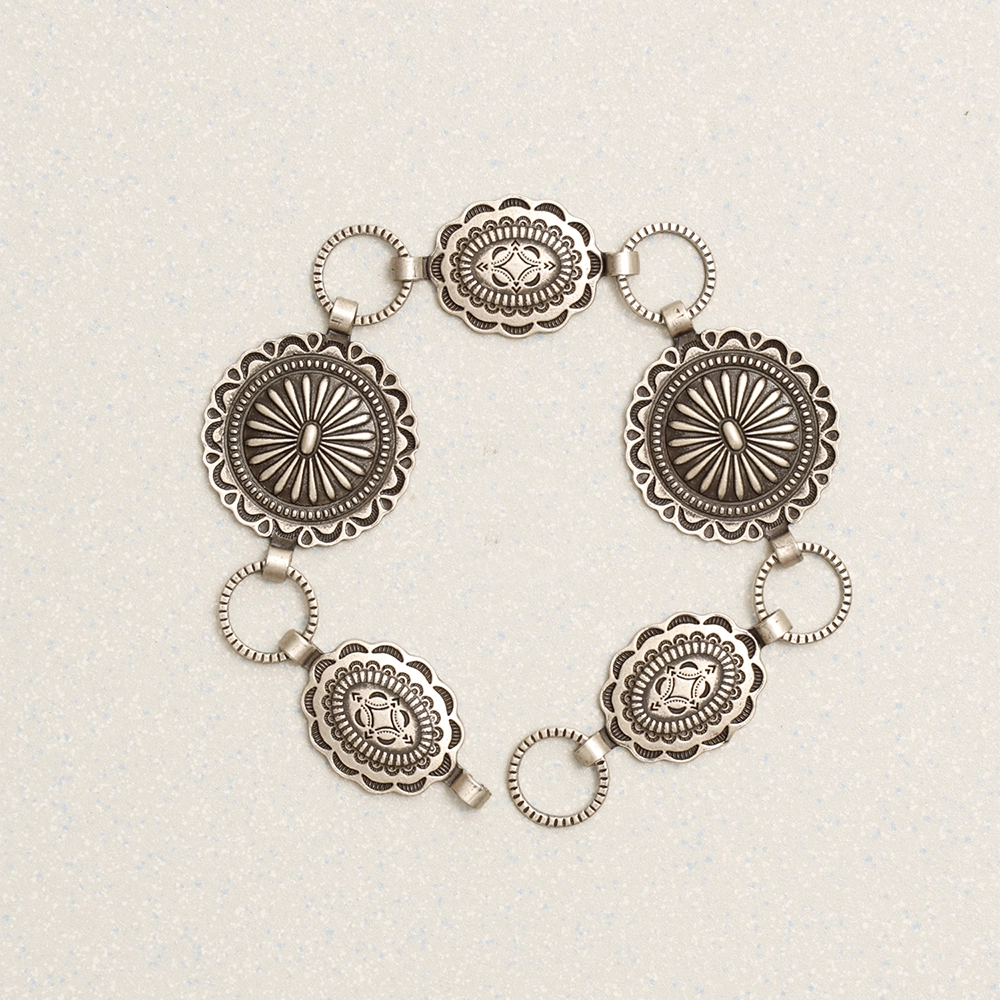 플라워 형태의 콘초와 스탬프 디테일이 은은한 빈티지 실버 톤과 어우러져,성의 경계를 구별하지 않고 멋을 추구하는 누구나라면 매력을 뽐낼 수 있는 팔찌 입니다.