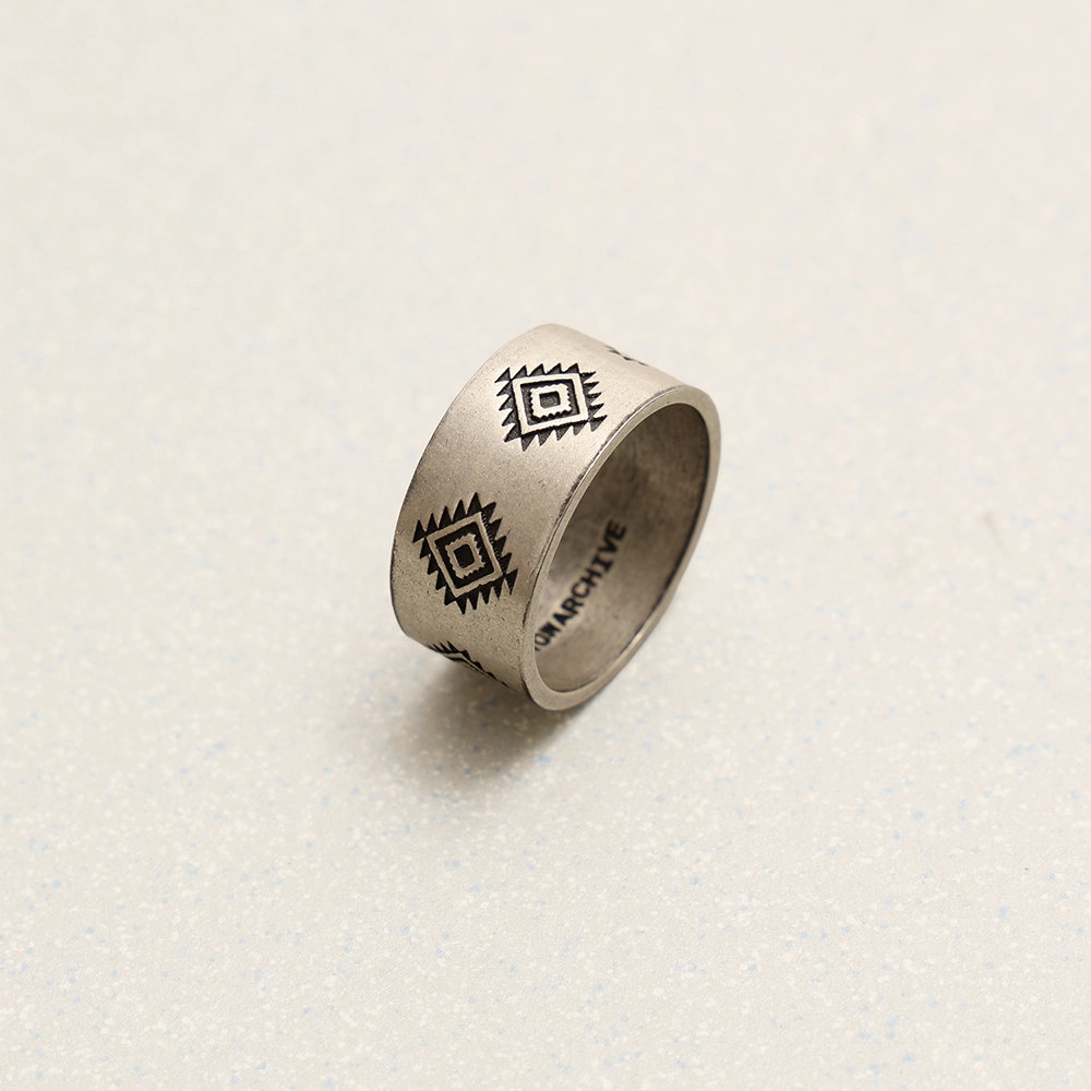 버니시된 표면의 거친 결 위에, 에스닉한 스탬프 문양을 반복 각인한 와이드 링입니다.